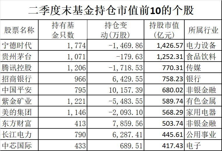 据数据显示,以持仓市值计算,今年二季度末基金前十大重仓股变化不大,宁德时代、贵州茅台、腾讯控股、招商银行仍然稳居重仓股前4名之位,持仓市值分别为1427亿元、1252亿元、770亿元和758亿元,除招商银行外,其余3只股均有上千只基金重仓持有,不过相较之下,这3只个股的基金重仓数量较一季度末均有所减少。